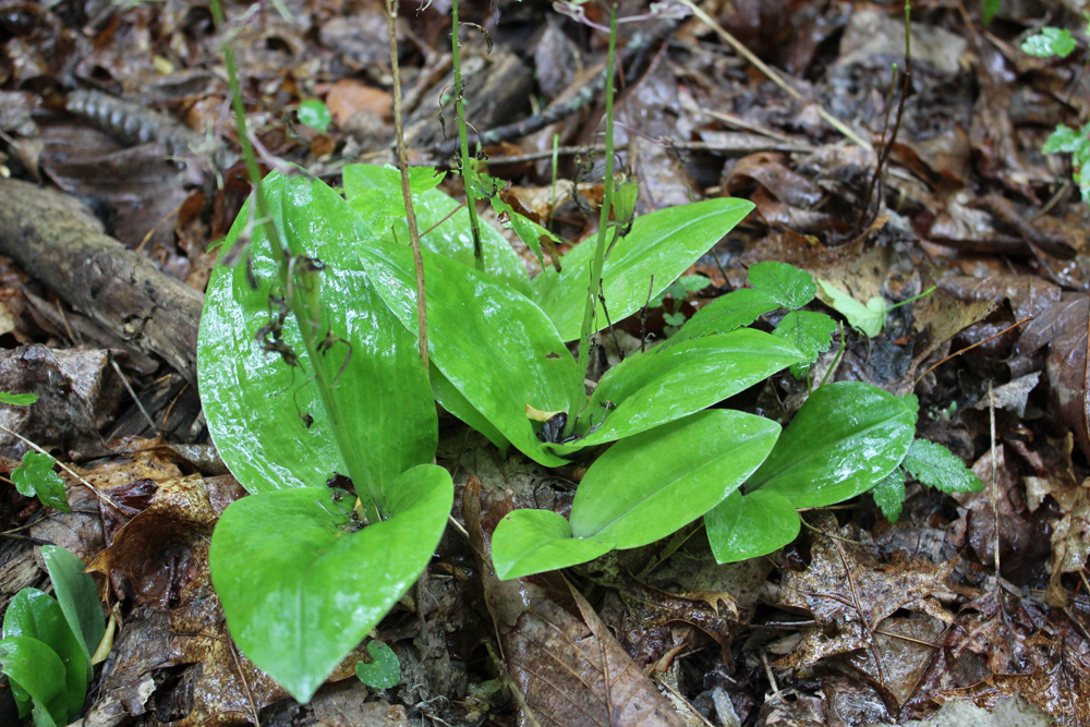 This inconspicuous, native orchid blooms in May and June. Each plant grows from a new underground corm; the previous year’s corm withers away. Two oval, waxy leaves emerge in April and eventually reach 4 to 6 inches in height. The small flowers begin to form in May, and are clustered on a single stalk. Note in the picture above how they open from the bottom of the stalk first.